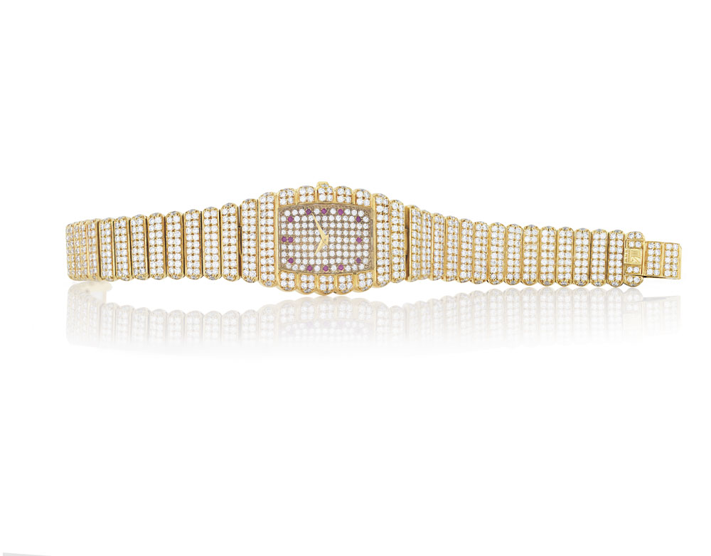 C. n. 59369 rettangolare in oro giallo 18 kt con fronte in brillanti e fondello chiuso da viti. Q. in pavè di brillanti con indici in rubini. M. a carica manuale. Bracciale in oro giallo 18 kt e brillanti. Cassa, movimento e bracciale firmati.