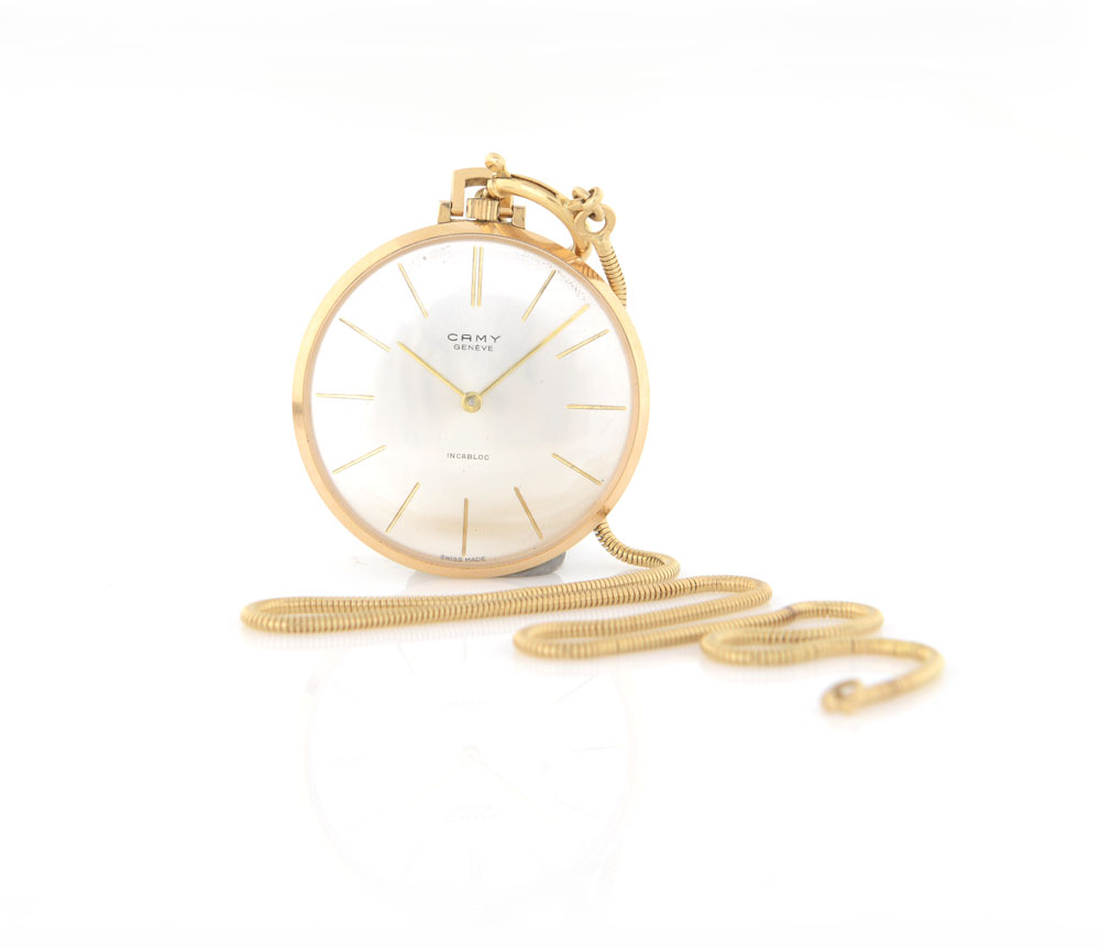 C. in oro rosa 18 kt. Q. argentato con indici smaltati. M. a carica manuale. Quadrante firmato. Completo di catena in oro rosa 18 kt.