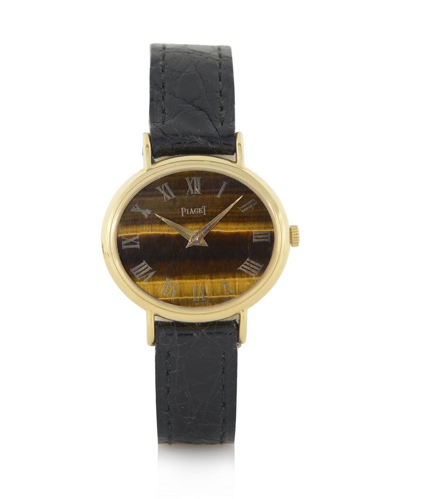 C. n. 147140 ovale in oro giallo 18 kt e vetro zaffiro. Q. occhio di tigre con numeri romani smaltati. M. a carica manuale. Quadrante, cassa e movimento firmati.
