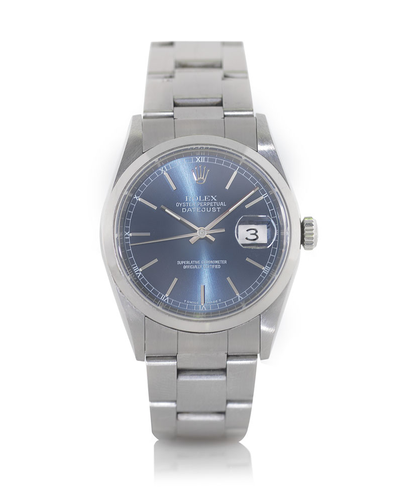 C. n. U780220 in acciaio con fondello e corona a vite, lunetta liscia e vetro zaffiro. Q. blu con indici applicati, secondi al centro e data al 3. M. a carica automatica. Bracciale Oyster in acciaio. Quadrante, cassa, movimento e bracciale firmati. Completo di astuccio e certificato del 12/1998.