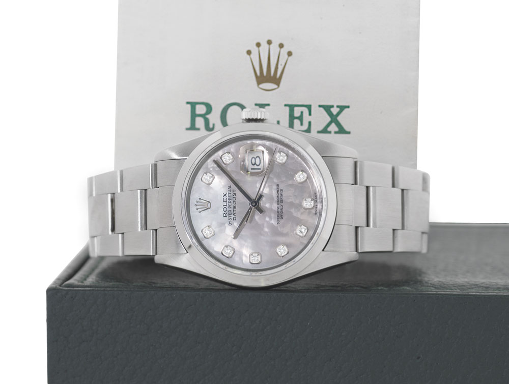 C. n. X972175 in acciaio con fondello e corona a vite, lunetta liscia e vetro zaffiro. Q. in madre perla con indici in brillanti, secondi al centro e data al 3. M. a carica automatica. Bracciale Oyster in acciaio. Quadrante, cassa, movimento e bracciale firmati. Completo di astuccio e certificato del 10/1994.
