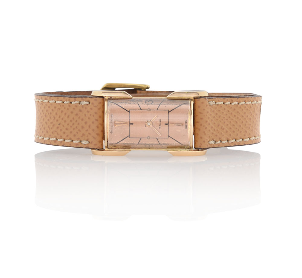 C. n. 212505 rettangolare in oro rosa 18 kt con anse curve, corona sul fondello e vetro bombato. Q. rosa con indici applicati e smaltati, numeri arabi smaltati. M. Duoplan, di forma su due piani, carica manuale. Quadrante, cassa e movimento firmati.