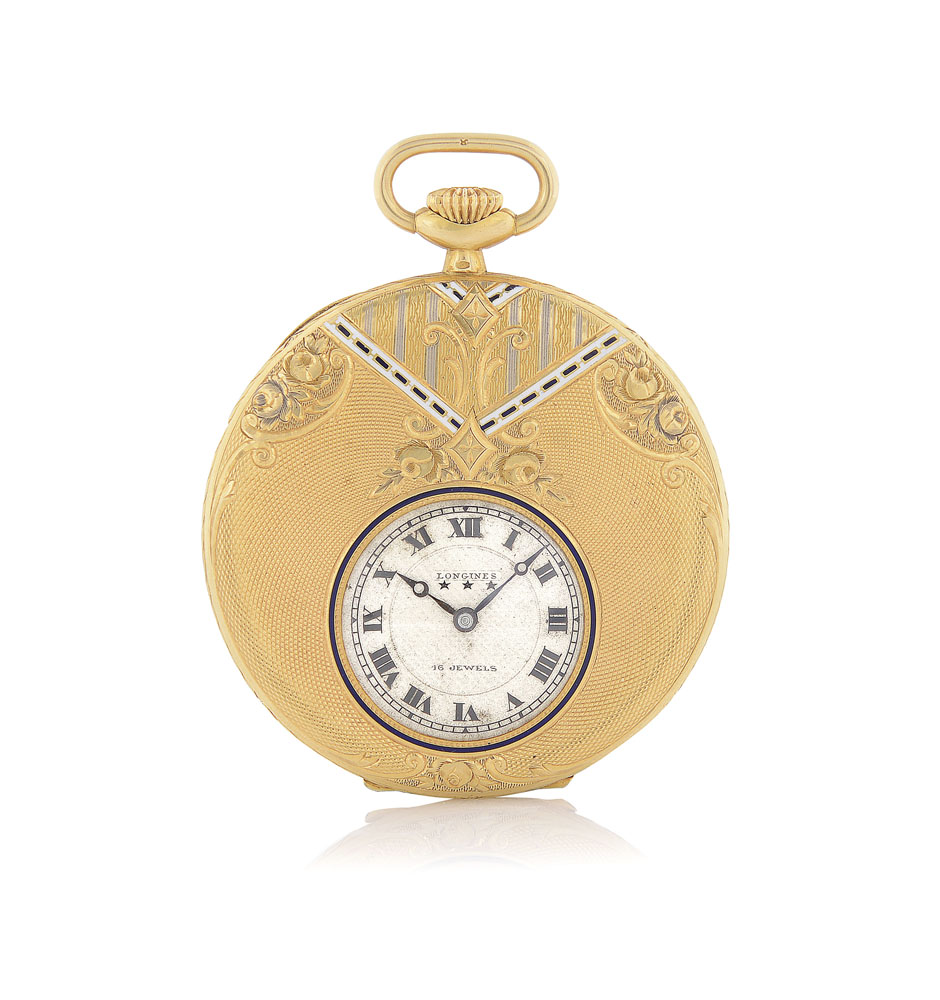 C. n. 2947833 in oro giallo 18 kt con incisioni, decori in smalto e monogramma inciso al retro. Q. decentrato, argentato inciso al centro con numeri romani smaltati. M. n. 2947833 cal. 11.87 con scappamento ad ancora, carica manuale. Quadrante, cassa e movimento firmati.