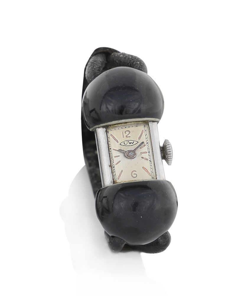 C. rettangolare in acciaio terminante con due semisfere in smalto nero. Q. argentato con indici e numeri arabi. M. di forma a carica manuale. Quadrante, cassa e movimento firmati. Completo di astuccio originale.