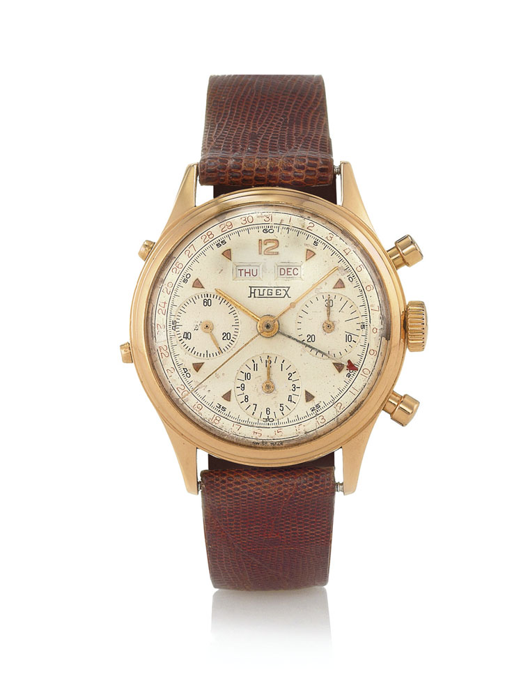 HUGEX CRONOGRAFO E CALENDARIO COMPLETO ANNI '50. C. n. 66449 in oro rosa 18 kt con fondello a vite e pulsanti tondi. Q. argentato con indici applicati, contatore a 30 minuti e 12 ore, finestrelle per giorno e mese al 12, data periferica. M. a carica manuale. Quadrante firmato.