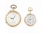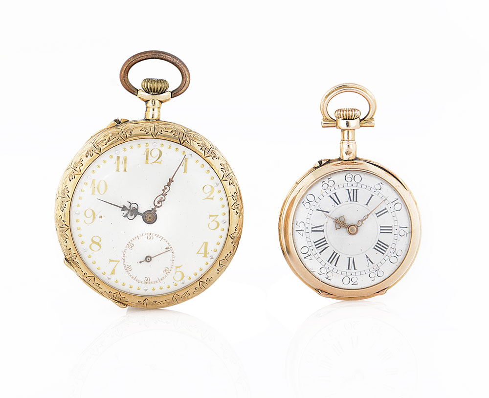 C. doppie casse, una in oro giallo 18 kt con incisioni ed una in oro rosa 18kt con iniziali in brillanti sul fondello. Q. in smalto, uno con numeri arabi e secondi al 6, uno con numeri romani, divisione a 60 minuti. M. in ottone dorato, scappamenti ad ancora, carica manuale.