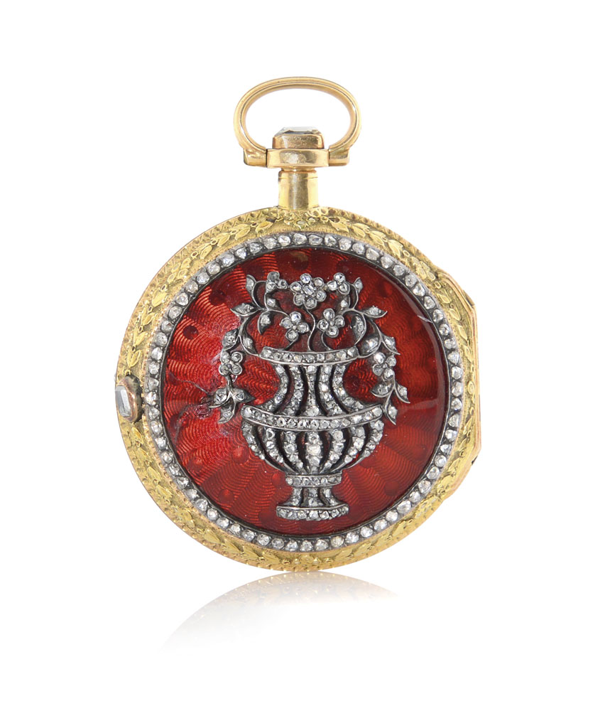 C. in oro giallo 18 kt con vaso di fiori in diamanti su fondo in smalto rosso, cornice in smalto e diamanti sul fronte. Q. in smalto con numeri romani e divisione a 60 minuti con numeri arabi. M. firmato e numerato, in ottone dorato con scappamento a verga, suoneria a richiamo delle ore e dei quarti, carica a chiavetta.
