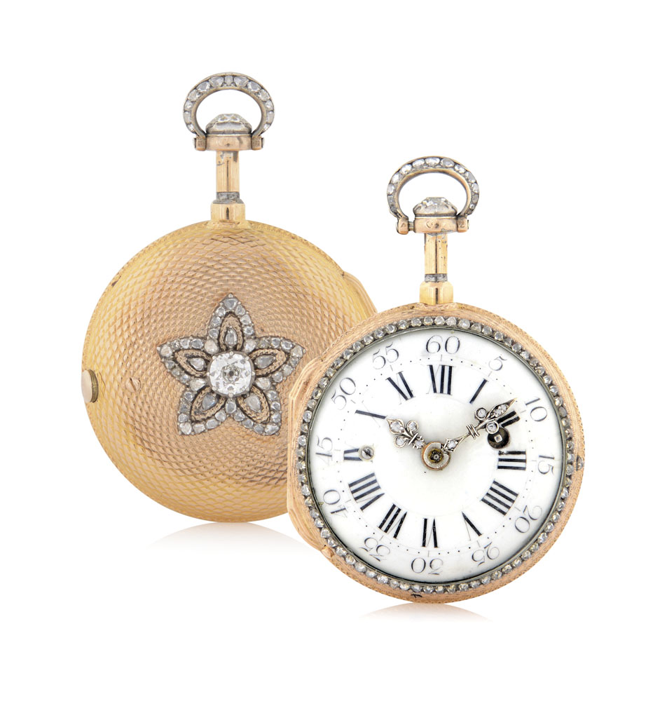 C. in oro giallo 18 kt incisa guilloché con fiore in brillanti, lunetta e anello in brillanti, diamante solitario taglio vecchio al centro . Q. in smalto con numeri romani e divisione a 60 minuti con numeri arabi, lancette in brillanti. M. con suoneria a "Toc" a richiamo delle ore e dei quarti.