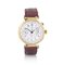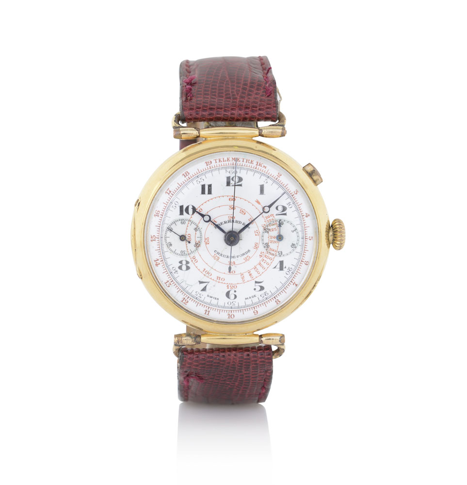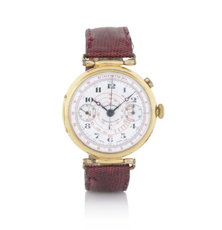 C. n. 195477 in oro giallo 18 kt con fondello a cerniera, pulsante ad oliva ed anse a maniglia. Q. in smalto con numeri arabi smaltati, contatore a 30 minuti, scala telemetrica periferica e tachimetrica a chiocciola. M. a carica manuale con ruota a colonna. Quadrante, cassa e movimento firmati.