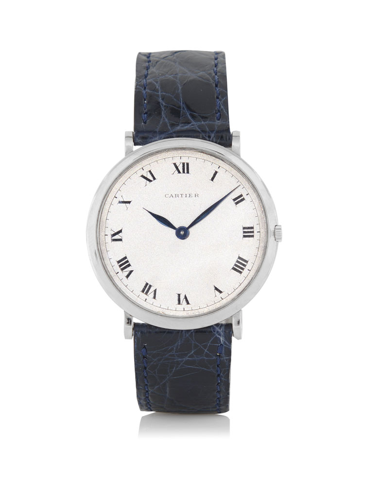C. piatta in oro bianco 18 kt. Q. argentato con numeri romani smaltati. M. a carica manuale. Quadrante, cassa e movimento firmati. Completo di fibbia deployante in oro bianco.