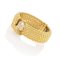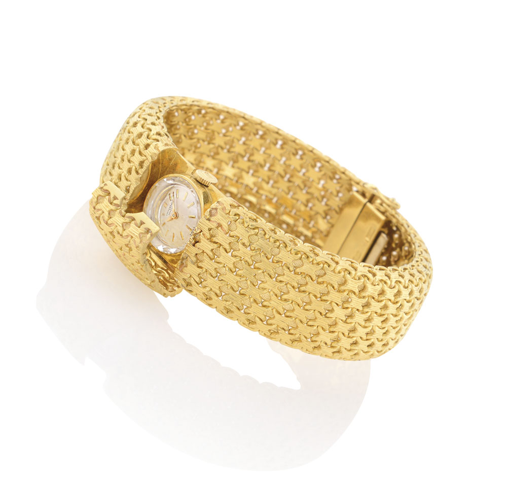 C. carré in oro giallo 18 kt inserita in un bracciale a tessuto lavorato e bombato, lucido e satinato. Copertura sul quadrante circolare argentato con indici applicati. M. a carica manuale. Quadrante, cassa e movimento firmati.