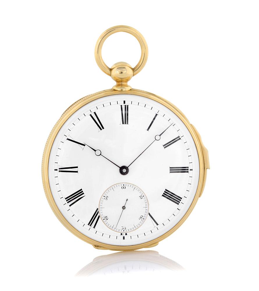 C. massiccia in oro giallo 18 kt con monogramma inciso su fondo guilloché, dedica interna incisa. Q. in smalto con numeri romani e secondi al 6. M. in ottone dorato, scappamento ad ancora, suoneria a richiamo delle ore e dei quarti, carica a chiavetta. Cassa firmata e numerata.