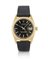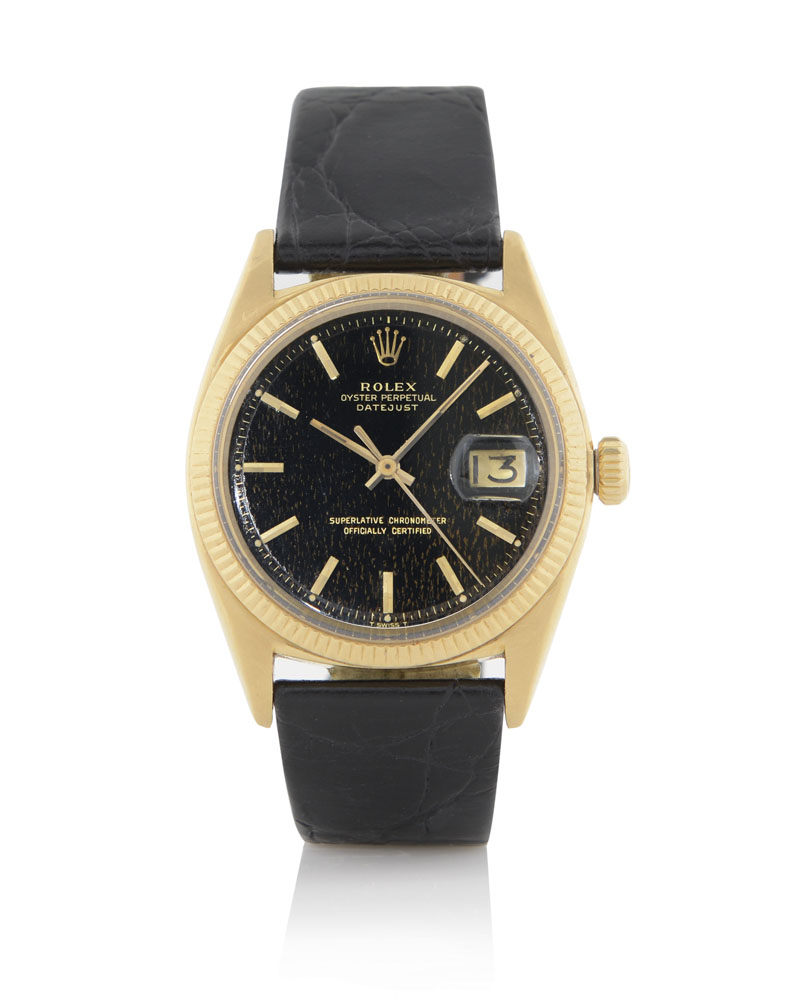 C. n. 680537 in oro giallo 18 kt con fondello e corona a vite, lunetta godronata. Q. nero con micro virature ad effetto corteccia, indici applicati, secondi al centro e data al 3. M. a carica automatica. Quadrante, cassa e movimento firmati.