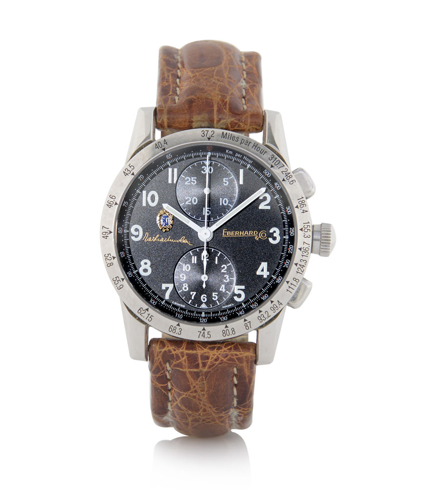 C. in acciaio con oblò sul fondello chiuso da viti, corona a vite, pulsanti rettangolari, lunetta con scala in miglia e vetro zaffiro. Q. nero con numeri arabi e lancette luminescenti, contatore a 30 minuti e 12 ore, scala tachimetrica periferica. M. a carica automatica con automobile (Alfa Romeo tipo C) in oro a rilievo sul rotore. Quadrante, cassa e movimento firmati. Completo di fibbia in acciaio originale.