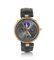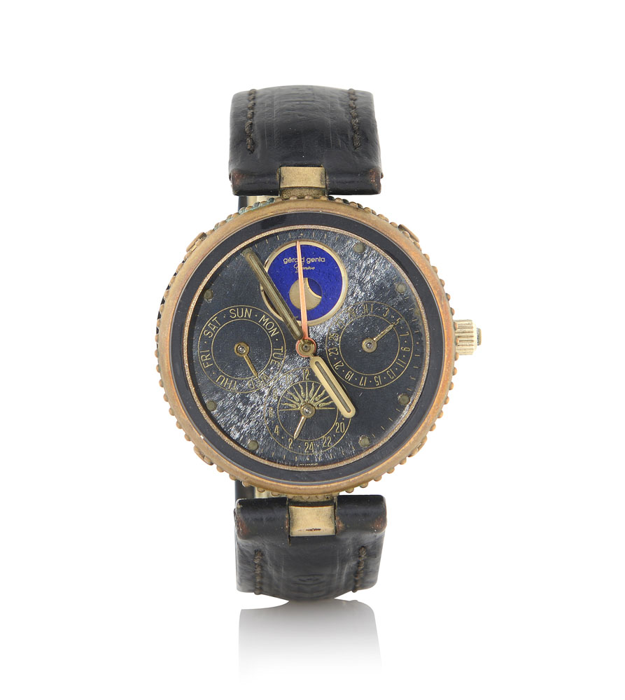 C. in acciaio e bronzo con fondello a vite e profili perlinati, anse centrali. Q. in ardesia con indici e lancette luminescenti, giorno e data a sfera, 24 ore al 6 e fasi luna al 12, lancetta rossa centrale per la sveglia. M. al quarzo.