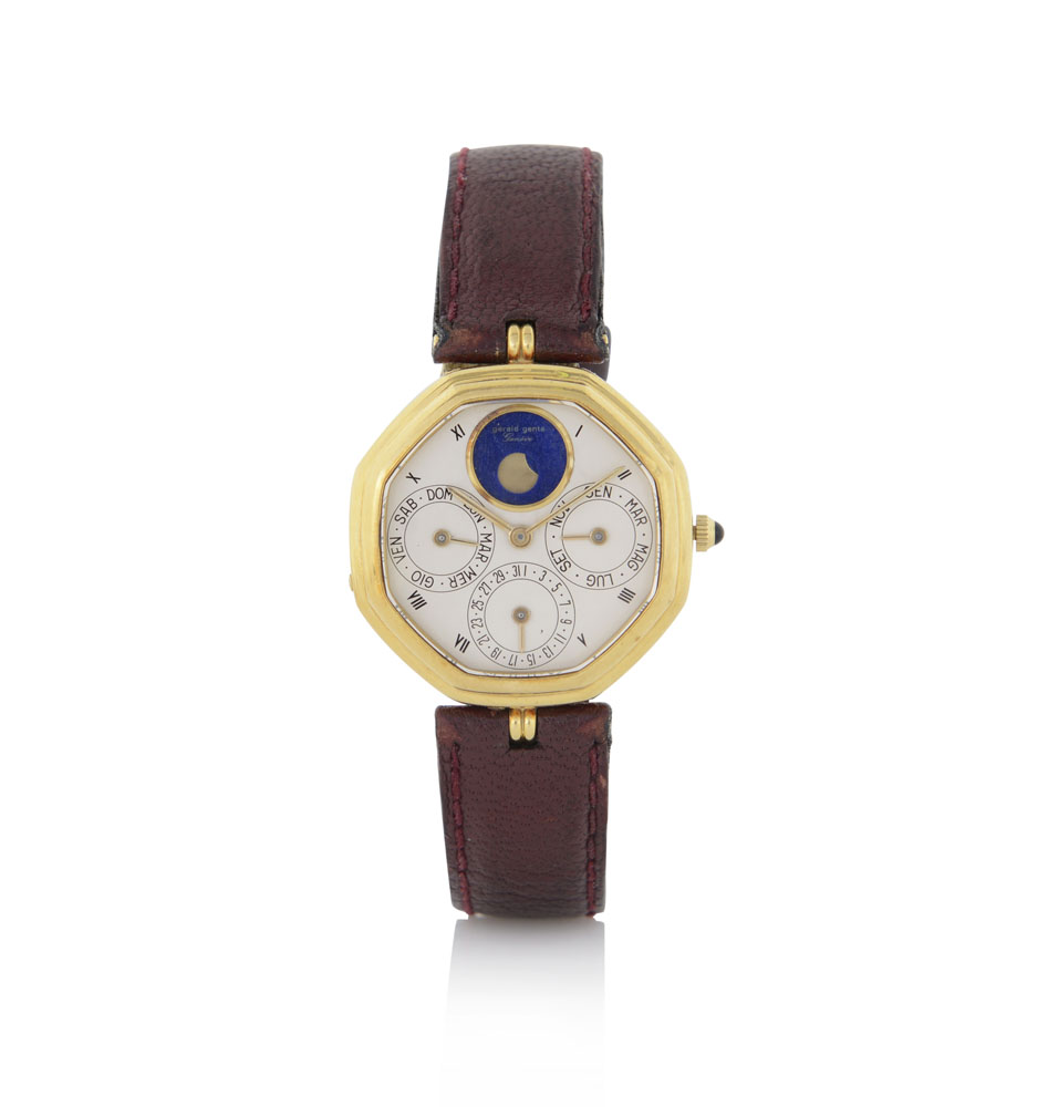 C. ottagonale in oro giallo 18 kt. Q. argentato con numeri romani smaltati, giorno, mese e data a sfera, fasi luna al 12. M. a carica automatica. Quadrante, cassa e movimento firmati. Completo di cinturino, fibbia in oro giallo 18 kt, astuccio e certificato in bianco originali.