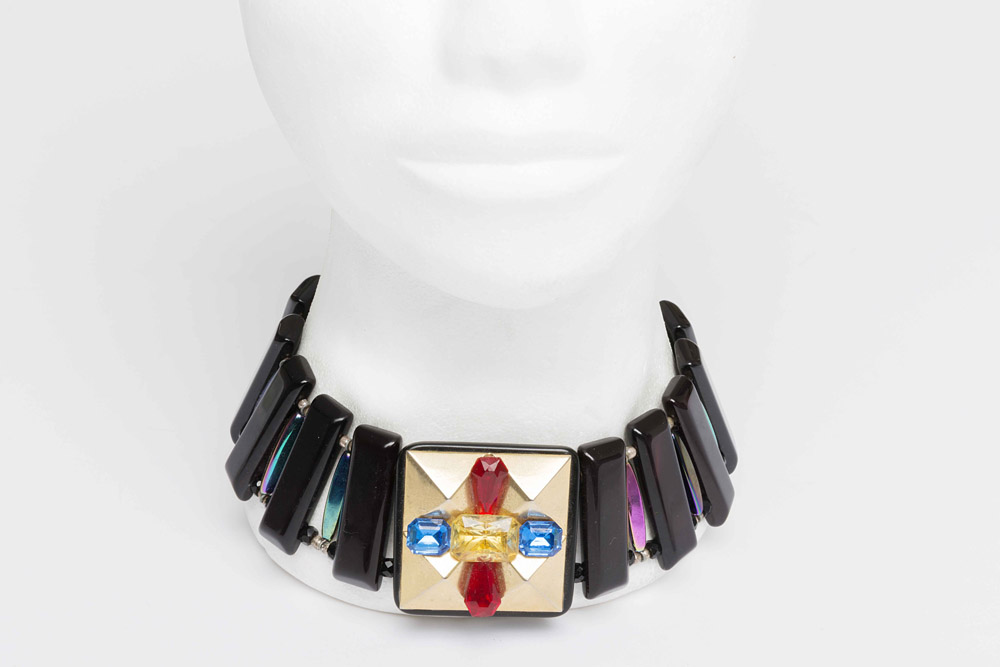 Paolo Bellini: collier de chien con moduli rettangolari in galalite nera e affusolati sui toni del verde e del viola, al centro grande piastra color oro e pietre di vetro
