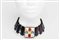 Paolo Bellini: collier de chien con moduli rettangolari in galalite nera e affusolati sui toni del verde e del viola, al centro grande piastra color oro e pietre di vetro
