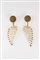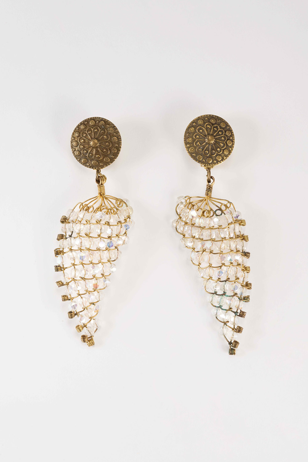 Orecchini campione per sfilata con al lobo motivo a scudo tondo e disegni a rilievo, pendente a grappolo con perline cangianti lavorate a filo (difetti)