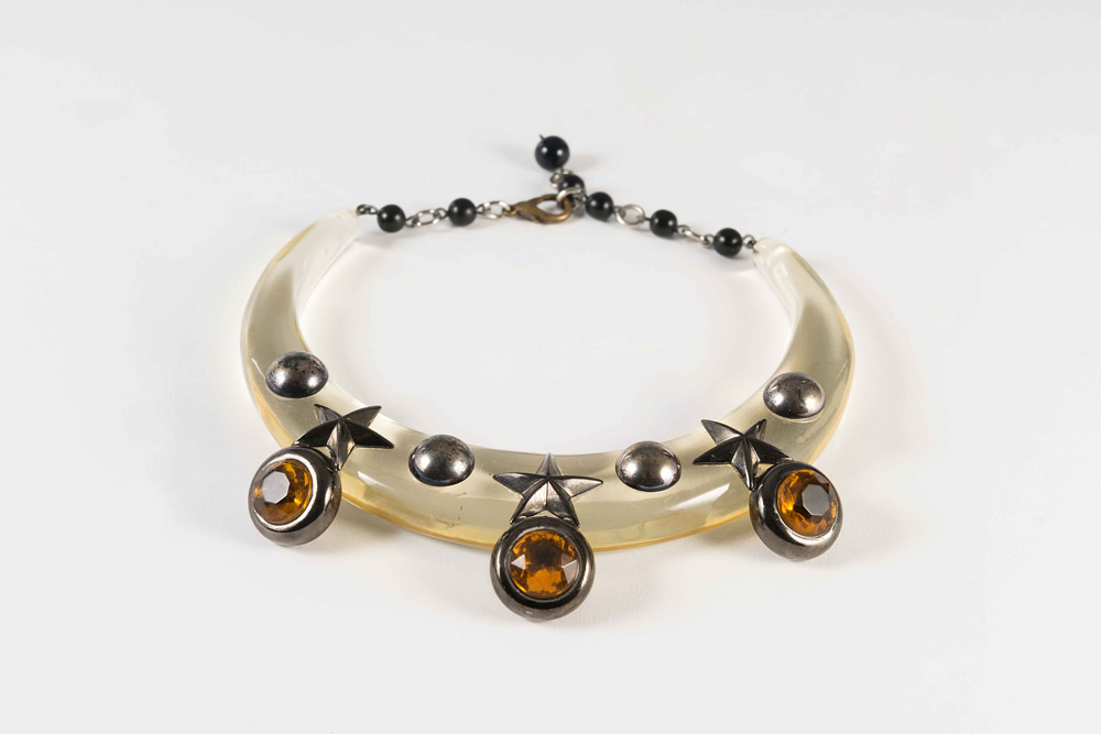 Paolo Bellini: collier rigido in resina trasparente con elementi in metallo...