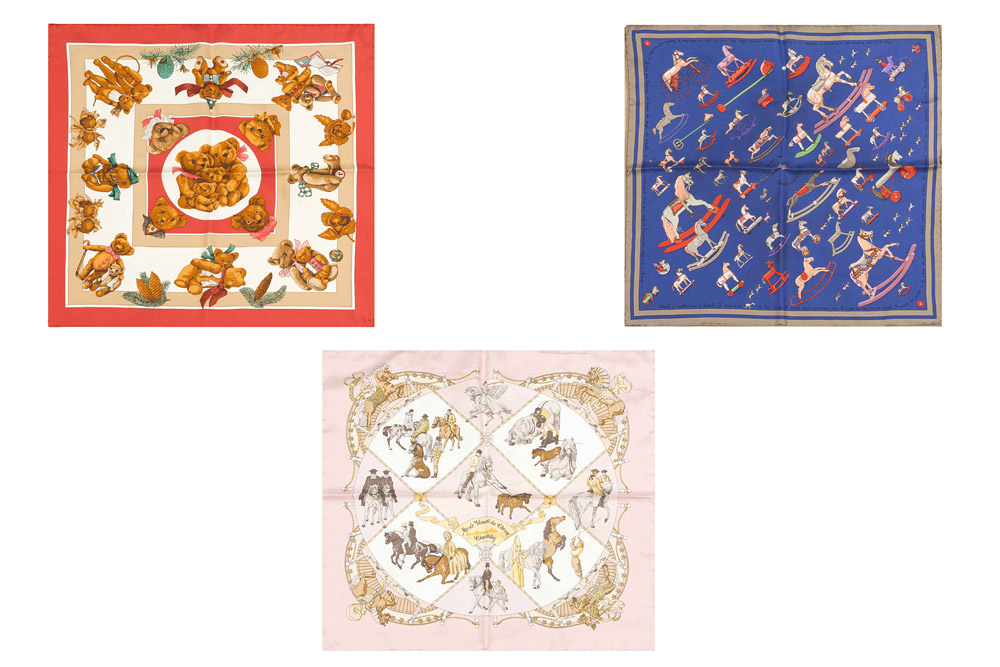 Hermes Paris: lotto composto da tre piccoli foulard in seta. Uno stampa...