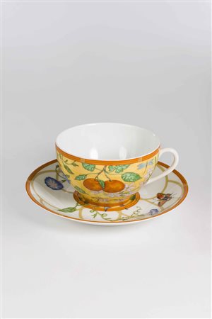 Hermes Paris: una tazza da tè con piattino in porcellana policroma con decoro...