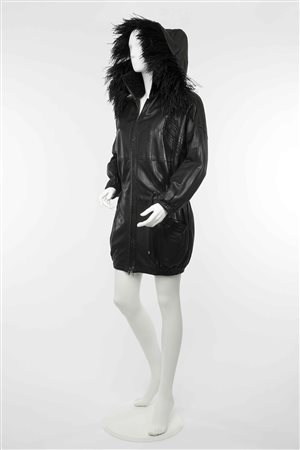 Gianni Versace: giaccone in pelle nera con arricciatura in vita, cappuccio removibile con bordura piumata (lievi difetti)