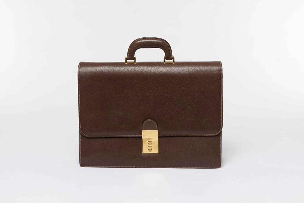Gucci: borsa ventiquattrore in pelle marrone e rifiniture color oro, largh. cm 41,5 (lievi difetti)