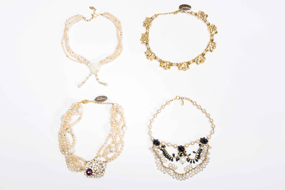 Borbonese: lotto composto da quattro collier di varia forma in metallo dorato con perle fancy, jet e strass (nuove)