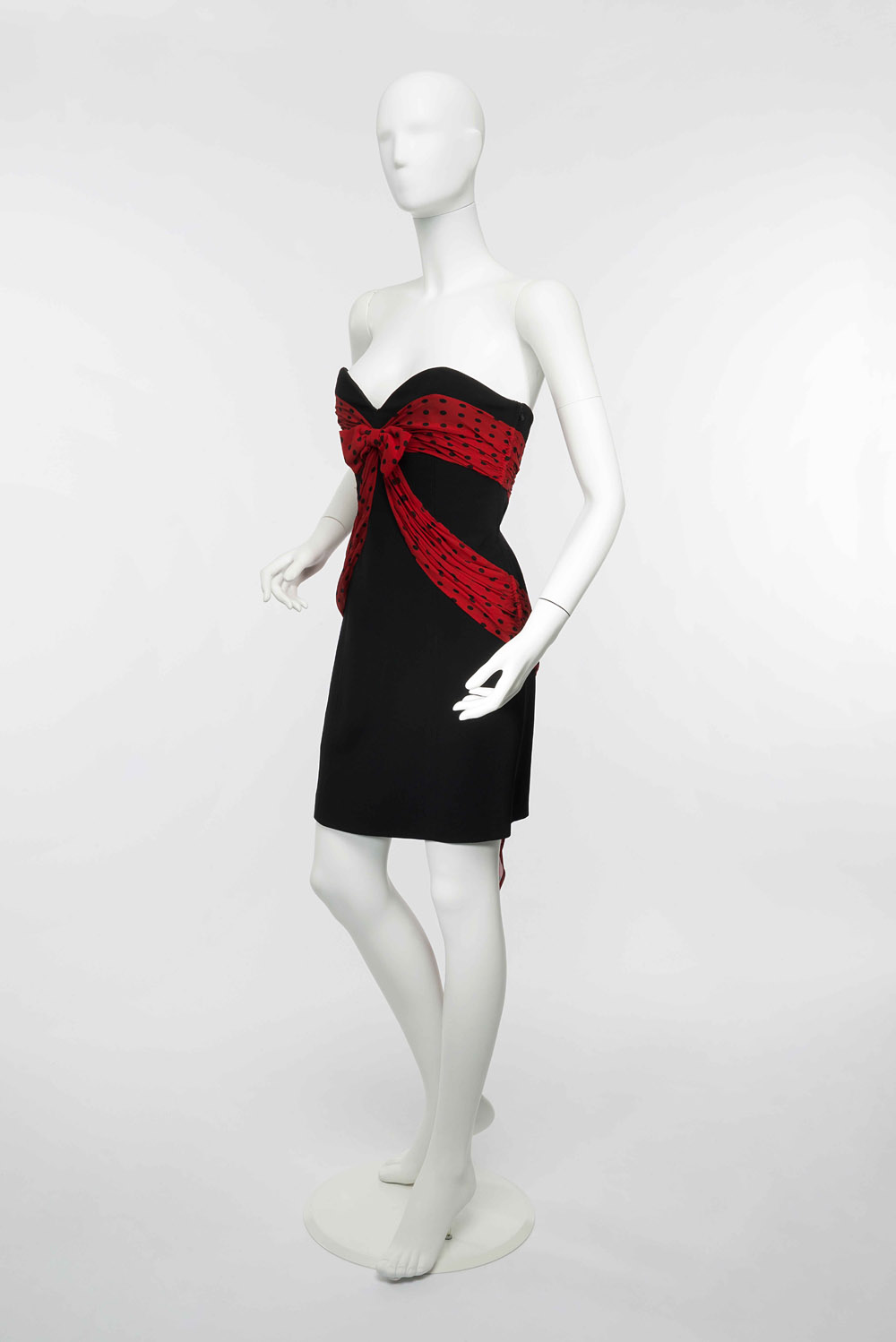 Moschino Couture: abito cocktail nero con finiture georgette rosse a pois neri a creare un fiocco sul retro, tg 44 (lievi difetti)