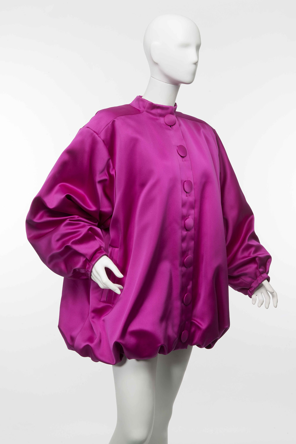 Yves Saint Laurent: giaccone imbottito in raso di seta color fucsia, interno trapuntato, chiusura a sette bottoni (lievi difetti)
