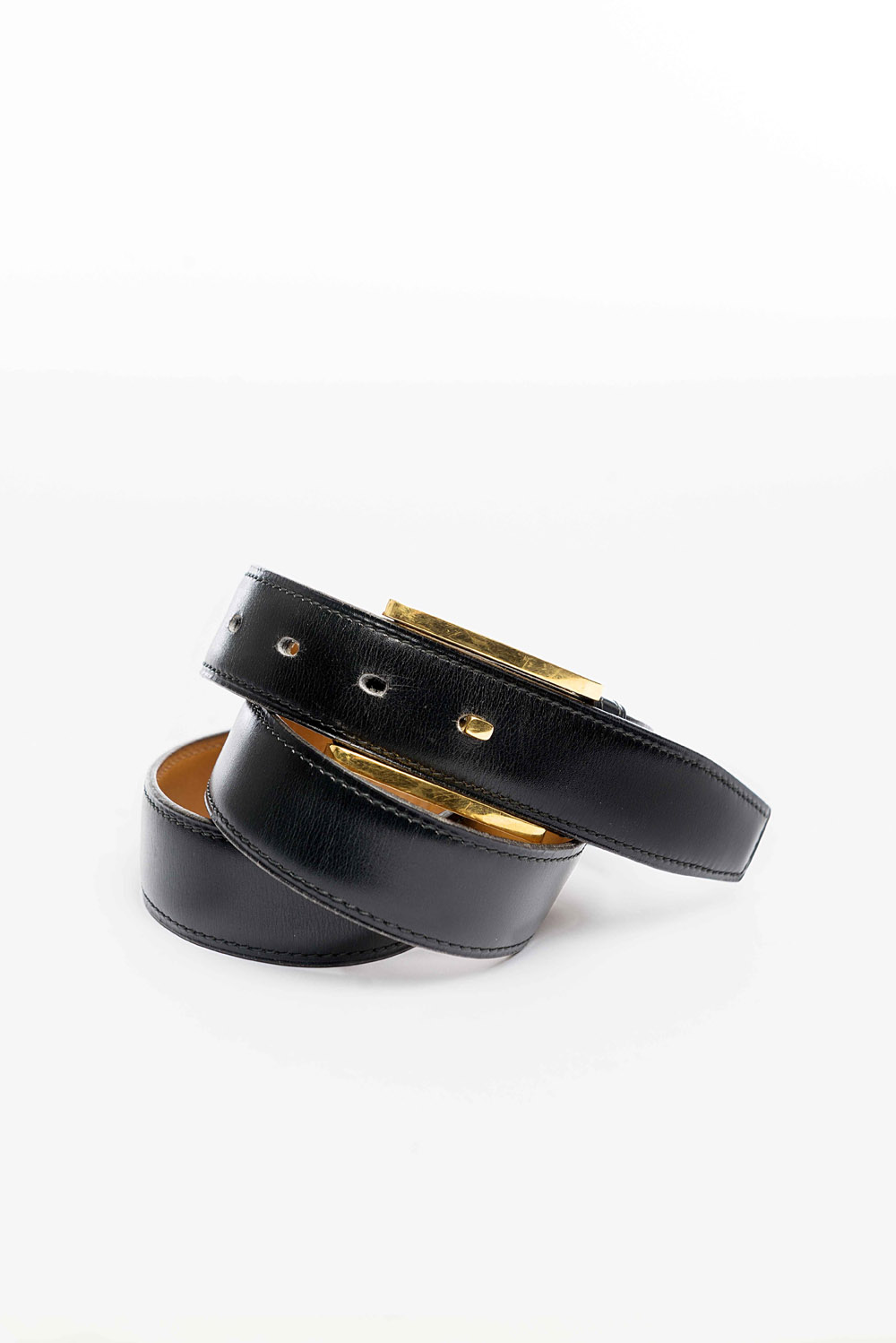 Hermes: cintura in pelle nera e fibbia in ottone color oro, lungh. cm 96...