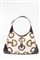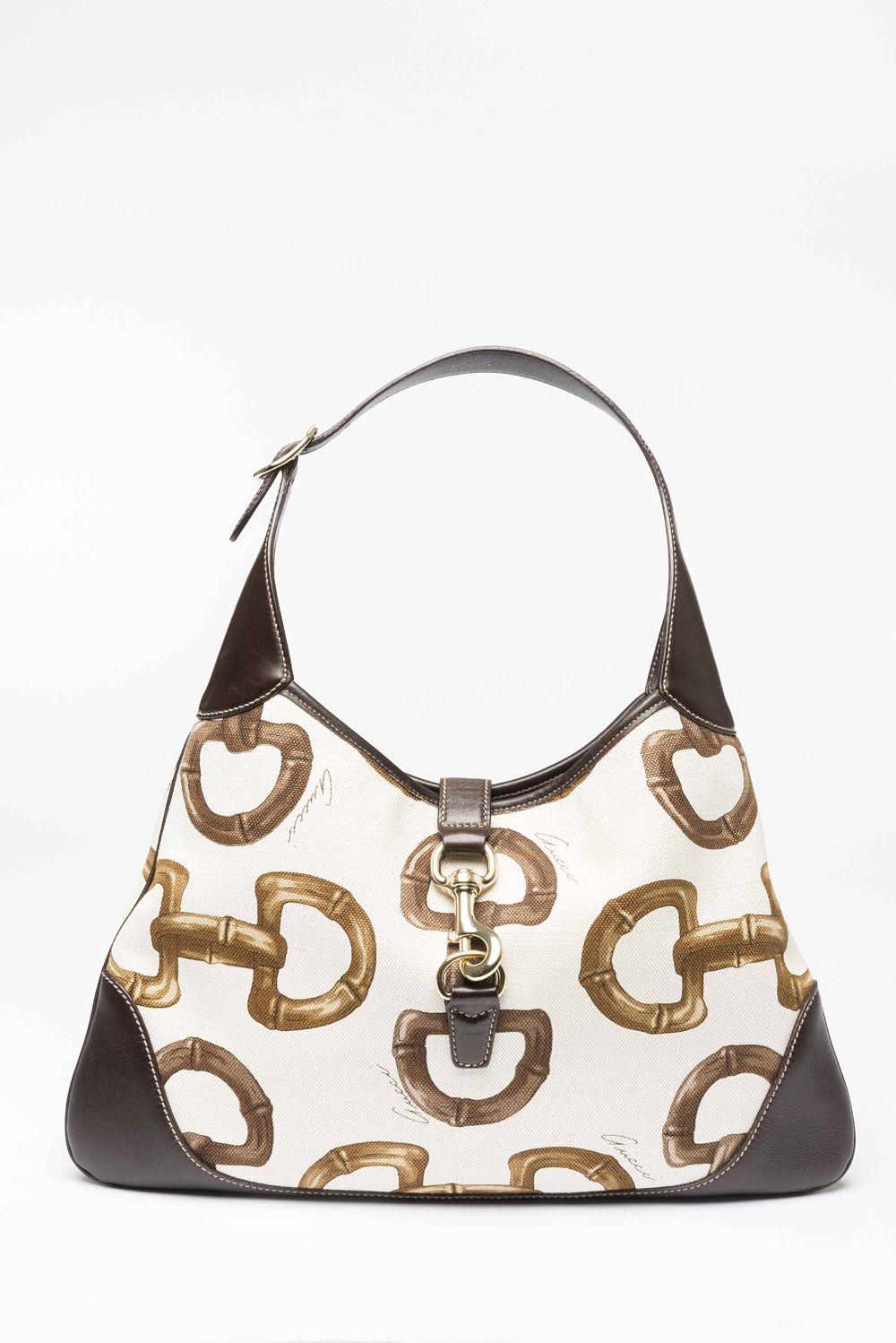 Gucci: borsa in tela, con motivo a staffa su fondo color avorio, finiture e tracolla in pelle marrone, largh. cm 39, in sacchetto originale