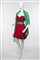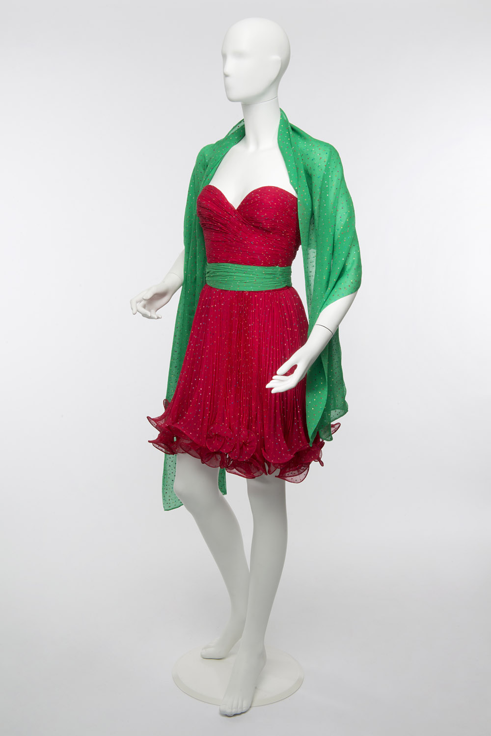 Raffaella Curiel: abito cocktail in chiffon plissè color ciliegia con sciarpa/cintura color verde