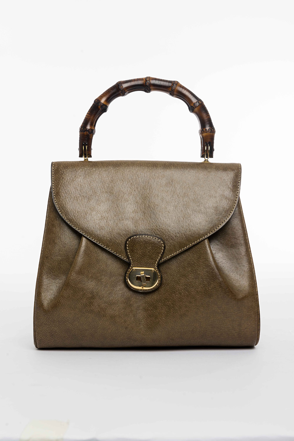 Gucci: borsa in pelle di cinghiale color verde oliva con manico in bambù, largh. cm 27, in sacchetto e scatola originali