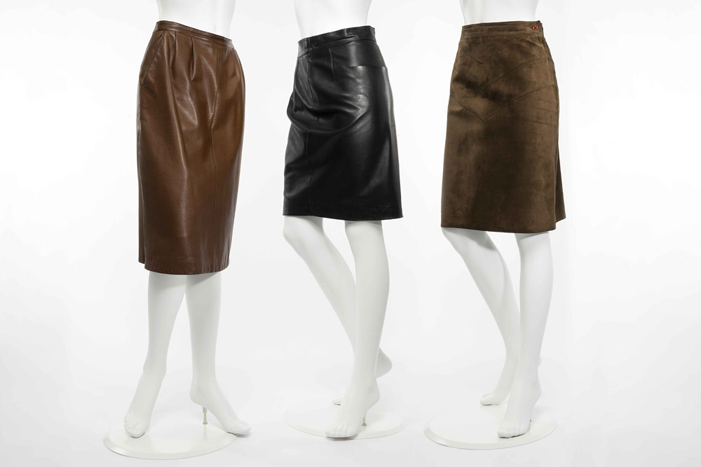 Hermes Paris, Gianfranco Ferré e Ungaro Parallele: lotto composto da tre gonne in pelle, una marrone con tasche, una nera (tg 44) e una scamosciata (tg 8 francese)