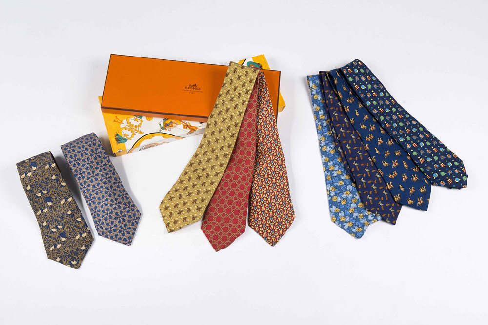 Hermes Paris: lotto composto da nove cravatte in seta, fantasie e colori differenti, in confezioni originali