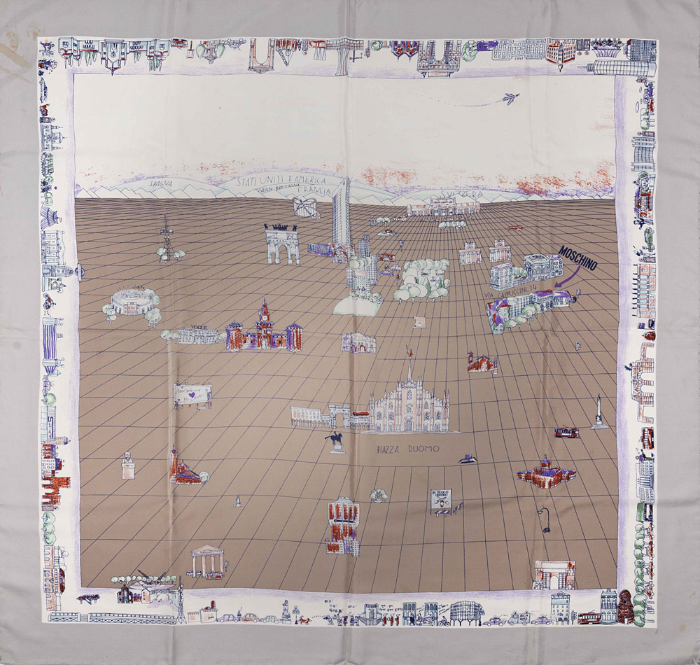 Moschino: foulard in seta, stampa con pianta di Milano sui toni del tortora e...