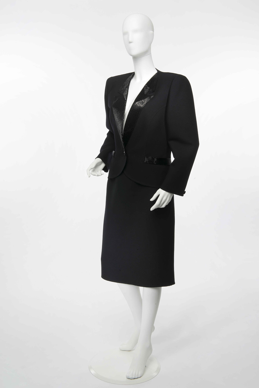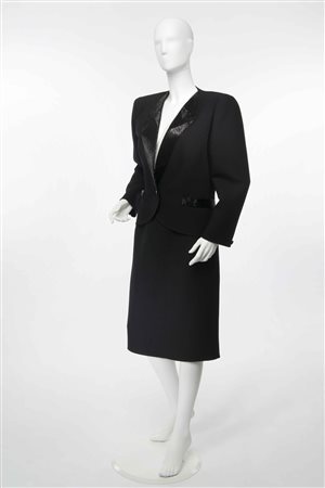 Mila Schon: tailleur gonna in lana nero con paillettes nere tubolari su tasche e revers, tg 46