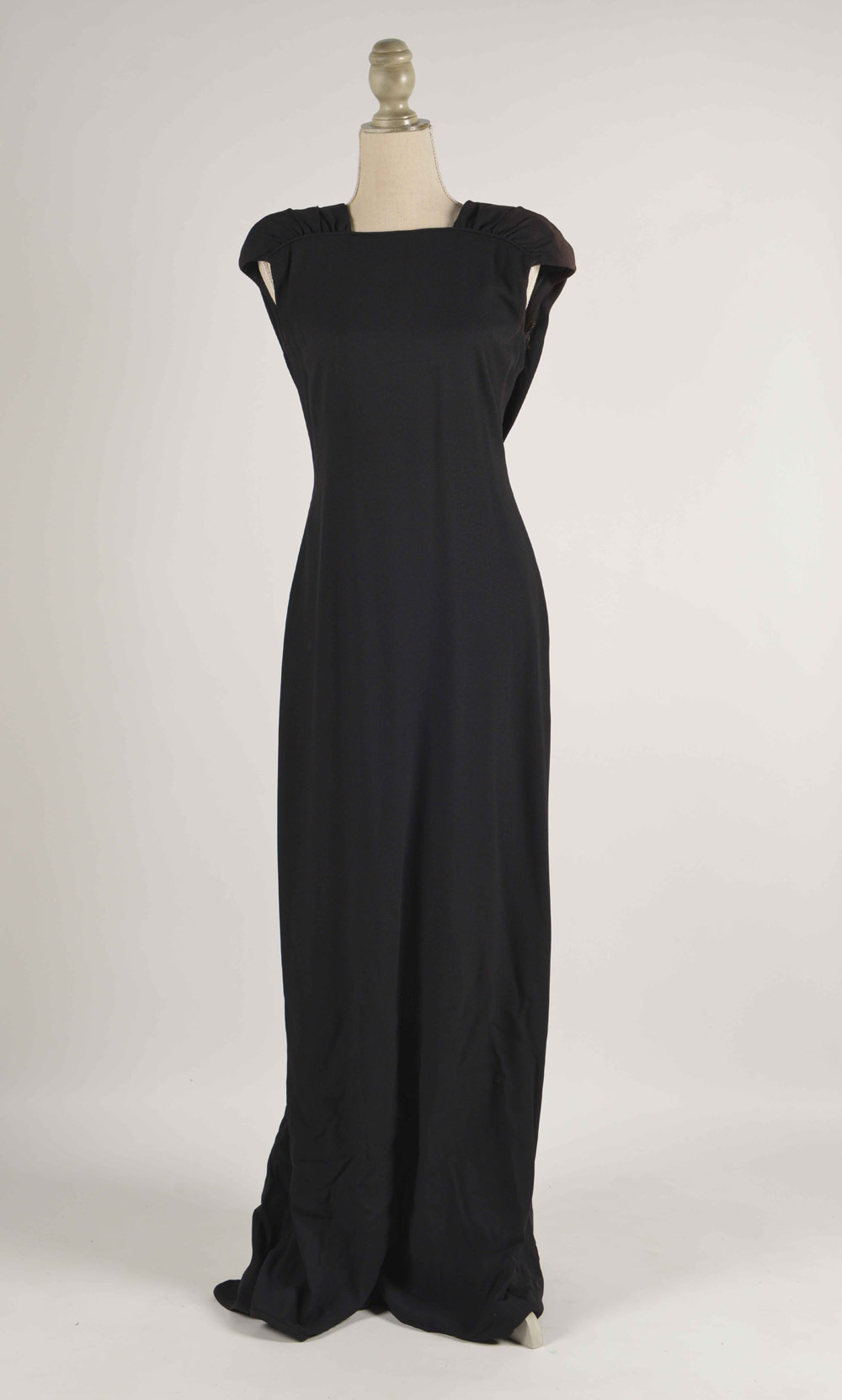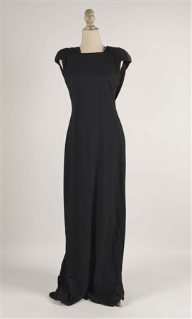 Valentino: abito da sera lungo in cotone color nero con grandi spalline, scollatura squadrata e balza centrale sul retro, tg 10 francese (lievi difetti, mancante di etichetta)