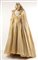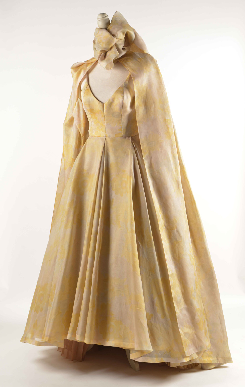 Gianfranco Ferrè Couture: vestito da sera composto da abito lungo con spalline, cappa con maniche in organza di seta a fantasia floreale sui toni del giallo, ocra e beige, e sottogonna a pieghe, tg 40 (lievi difetti)