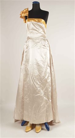 Lotto composto da un abito lungo monospalla firmato Valentino in seta color avorio e rifiniture color giallo oro, tg 8 francese, e da un paio di scarpe in seta giallo oro di Sebastian, mis. 39 (lievi difetti)