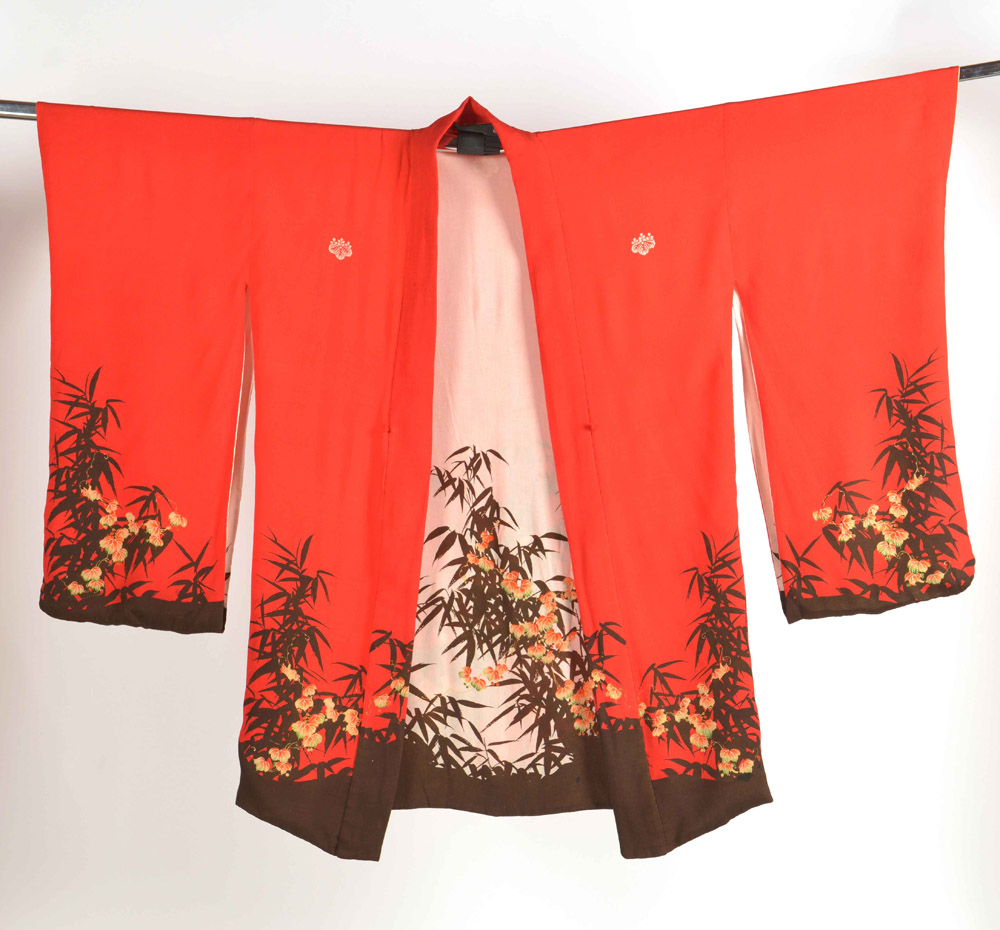 Kimono giapponese rosso con disegni bambù e interno color avorio con medesimo...