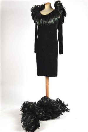 Lotto composto da un vestito nero aderente con scollo definito da piume nero...