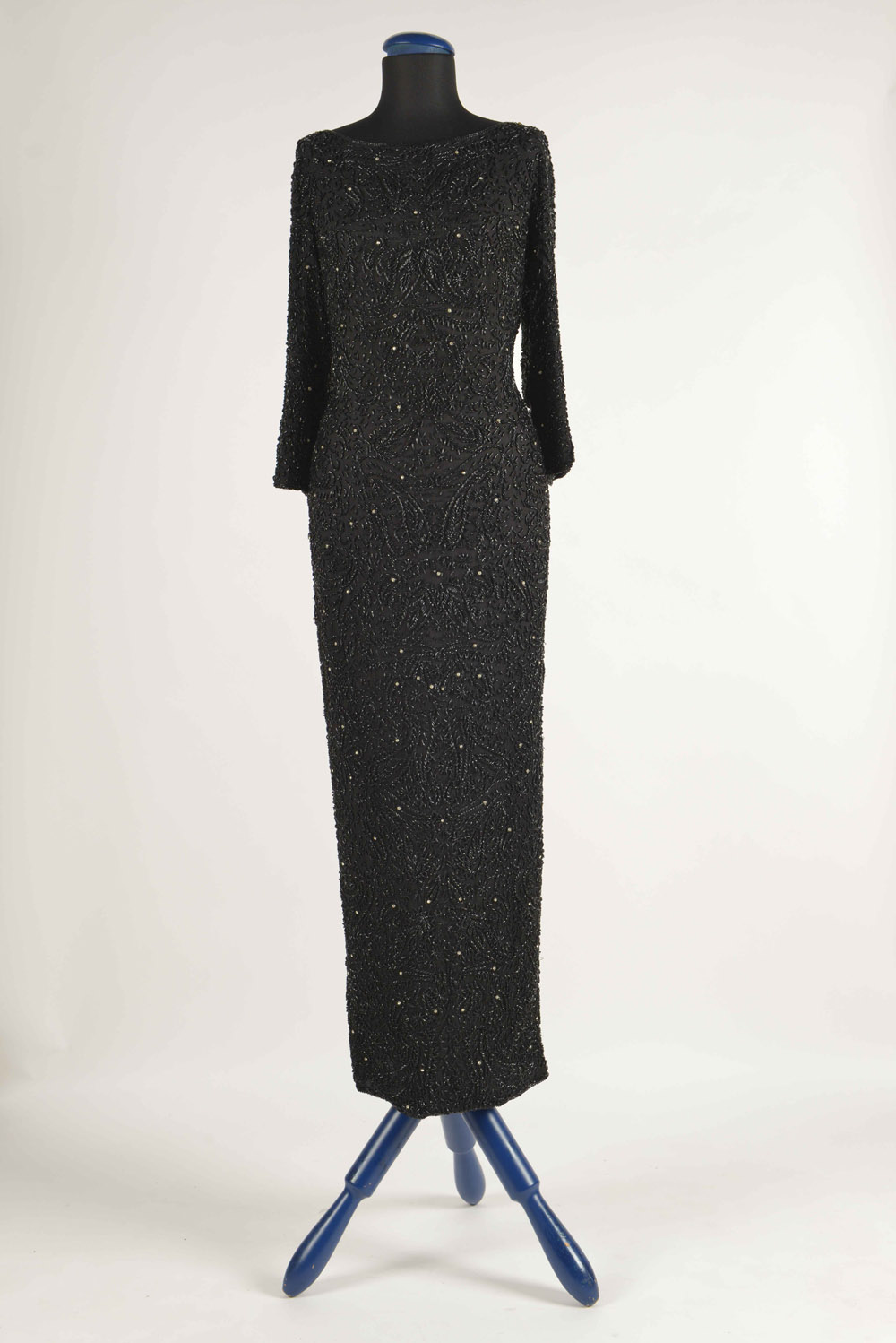 Katharine Hamnett: abito da sera con maniche lunghe e scollo sulla schiena, interamente ricamato con perline nere e strass bianchi, tg 42