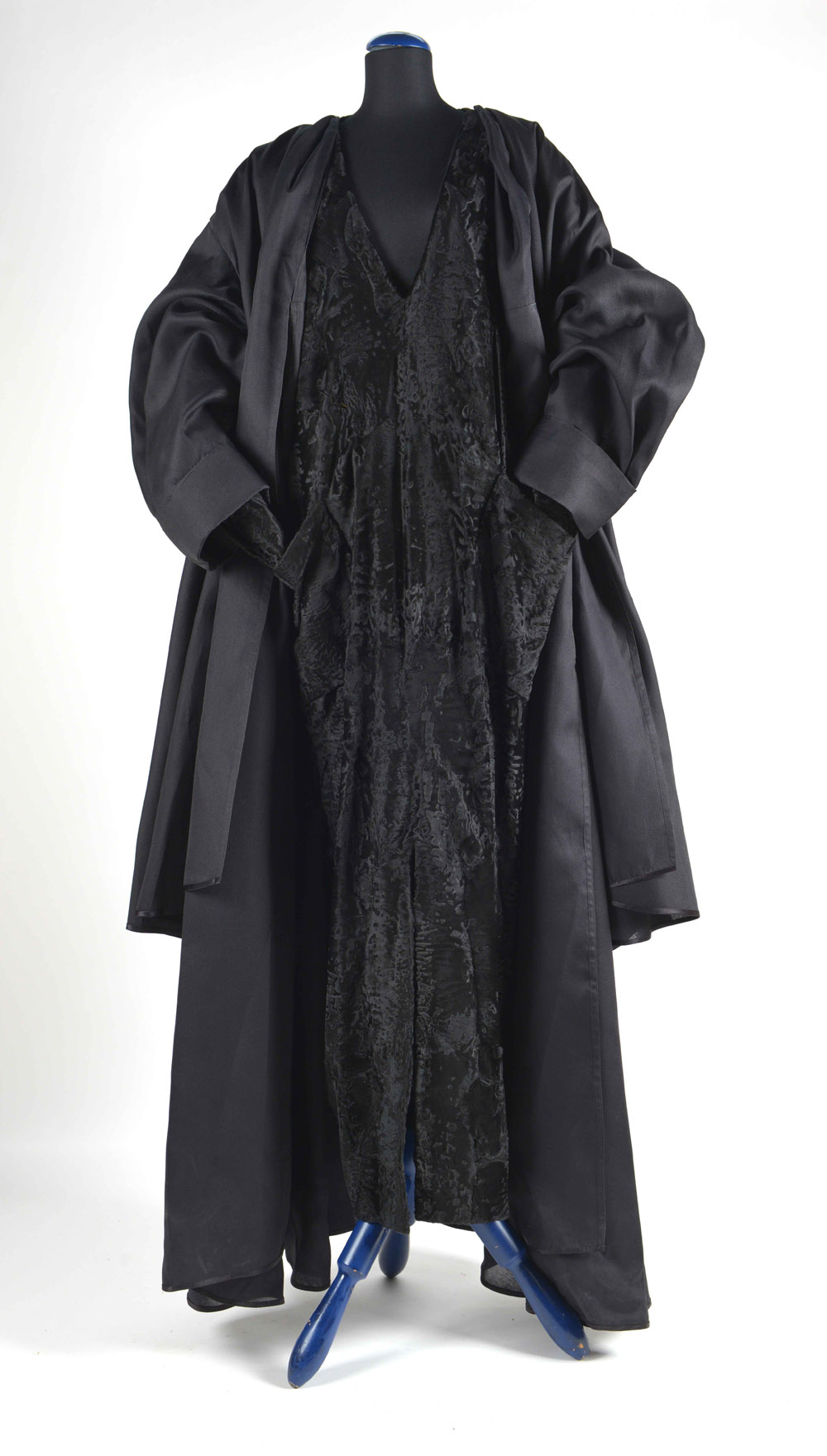 Gianfranco Ferrè: lotto composto da un abito da sera a manica lunga nero con scollo a V, spacco frontale e tasche esterne (tg 44) e cappa in gazzarre di seta nera con maniche