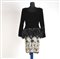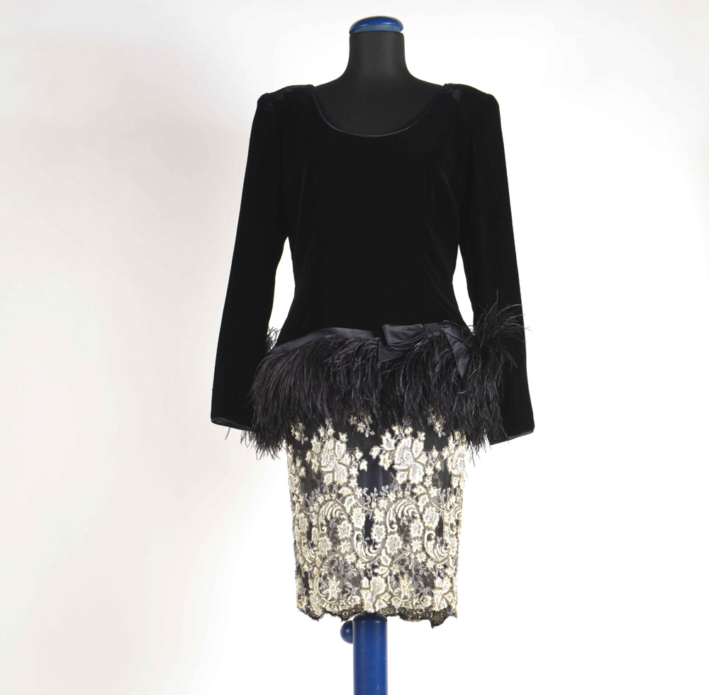 Valentino Night: vestito da cocktail con manica lunga nero, tagliato sul fianco da un nastro in raso nero e piume a cadere, su una gonna ricamata a rilievo con paillettes bianche e avorio, tg 44/46