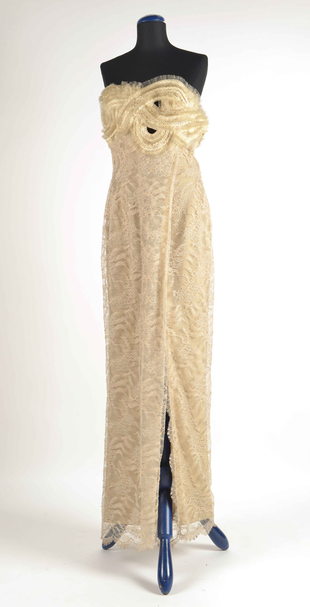Gianfranco Ferrè: vestito lungo da sera in seta, interamente ricoperto da pizzo su base color cipria e parte superiore decorata con motivo a volute, tg 38 (difetti)