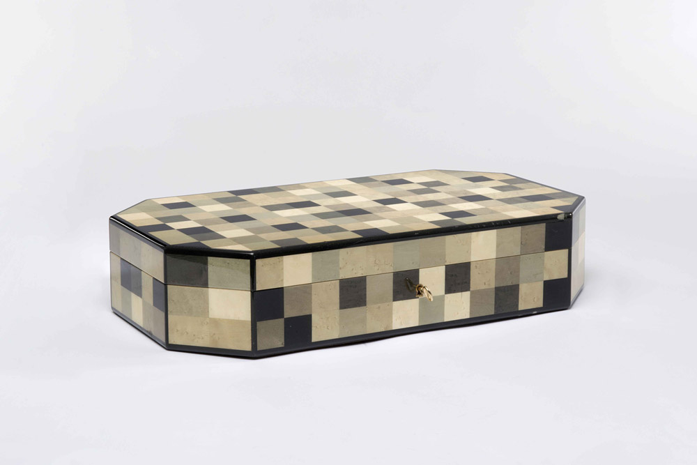 Hermes Paris: scatola ottagonale porta oggetti in legno rivestito da un mosaico in madreperla e lacca, con chiave, mis. cm 49x28x10 (lievi difetti)