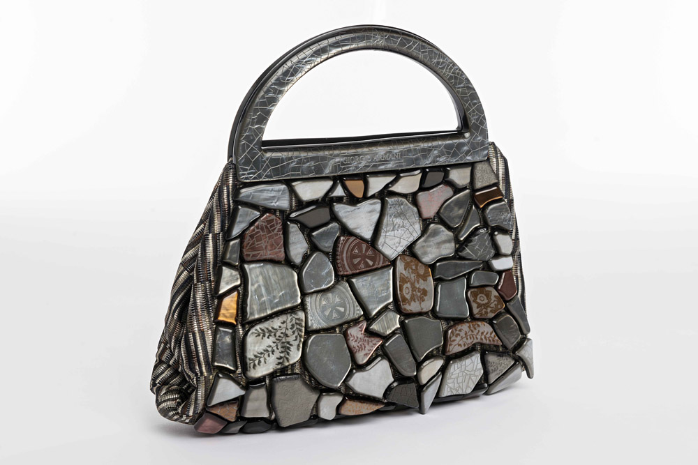 Giorgio Armani: borsa trapezio con mosaico in bachelite madreperlata sui toni del grigio, marrone e nero, manico in bachelite madreperlata grigia, n.YGW384-YC437, largh. cm 25, in sacchetto originale